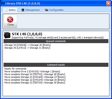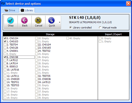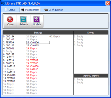 The library plugin also gives you access to a virtual screen of the library (see the library screen shots) which allows you to move tapes around the library, to drives and access ports. If your library is installed with a barcode reader (most libraries are) then you will also see the volume label of the tape as well.